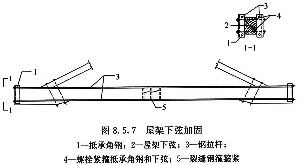 8.5.7??當(dāng)屋架下弦用料過小而下垂開裂時,可采用鋼拉桿補(bǔ)強(qiáng)(圖8.5.7)。鋼拉桿的斷面應(yīng)按計算確定,并應(yīng)對下弦桿的端部型鋼支承處進(jìn)行局部承壓驗算。