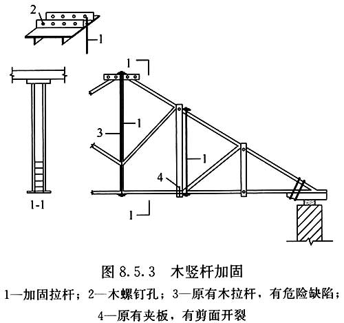 8.5.3??當(dāng)屋架受拉木豎桿開裂或螺孔拉裂,采用圓鋼拉桿補(bǔ)強(qiáng)時(圖8.5.3),應(yīng)按本標(biāo)準(zhǔn)第7章的有關(guān)規(guī)定計算。