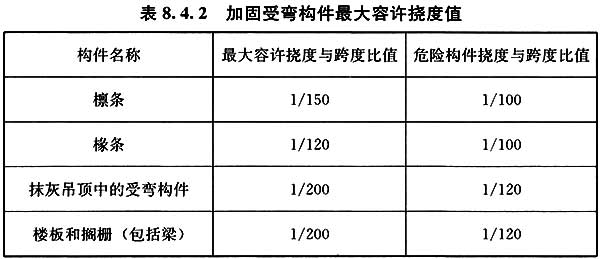 8.4.2??新?lián)Q受彎構(gòu)件應(yīng)符合現(xiàn)行國家標(biāo)準(zhǔn)《木結(jié)構(gòu)設(shè)計標(biāo)準(zhǔn)》GB?50005的有關(guān)規(guī)定;補(bǔ)強(qiáng)受彎構(gòu)件最大容許撓度值應(yīng)符合表8.4.2的規(guī)定。