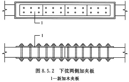 8.5.2??當(dāng)屋架下弦受拉木夾板斷裂,或螺栓間剪面開裂時,可重?fù)Q木夾板,其截面和所用螺栓數(shù)量均應(yīng)與更換前相符(圖8.5.2)。