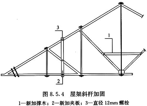 8.6.3??新增垂直支撐和水平支撐,或補(bǔ)強(qiáng)原支撐,應(yīng)符合現(xiàn)行國家標(biāo)準(zhǔn)《木結(jié)構(gòu)設(shè)計標(biāo)準(zhǔn)》GB?50005的相關(guān)規(guī)定。