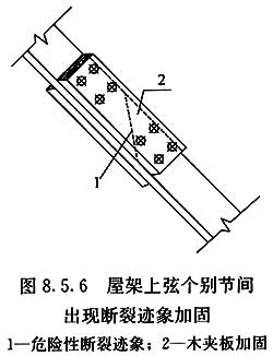 8.5.6??當(dāng)屋架上弦個別節(jié)間出現(xiàn)危險性斷裂跡象時,可采用木夾板和螺栓連接補(bǔ)強(qiáng)(圖8.5.6)。