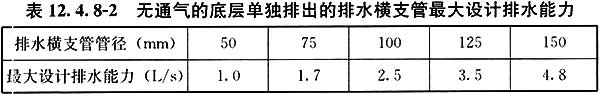 ????2??建筑底層無通氣的排水管道與其樓層管道分開單獨排出時,其排水橫支管的最大排水量不得大于表12.4.8-2的規(guī)定。